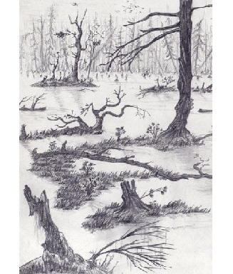 There is nothing but filthy water and mossy trees out here.There are muddy trails going north, west, east, and south. | Items carried:SwordMailYour options: Take the trail to the north. Take the trail to the west. Take the trail to the east. Take the trail to the south. |