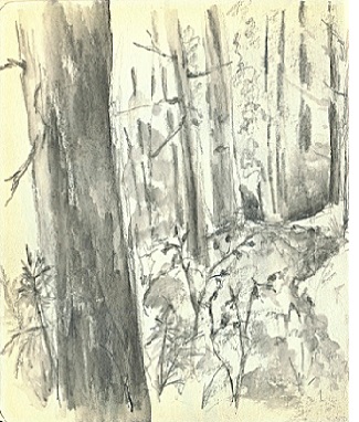 There is nothing here but swampy woods.There are muddy trails going north, west, and south.